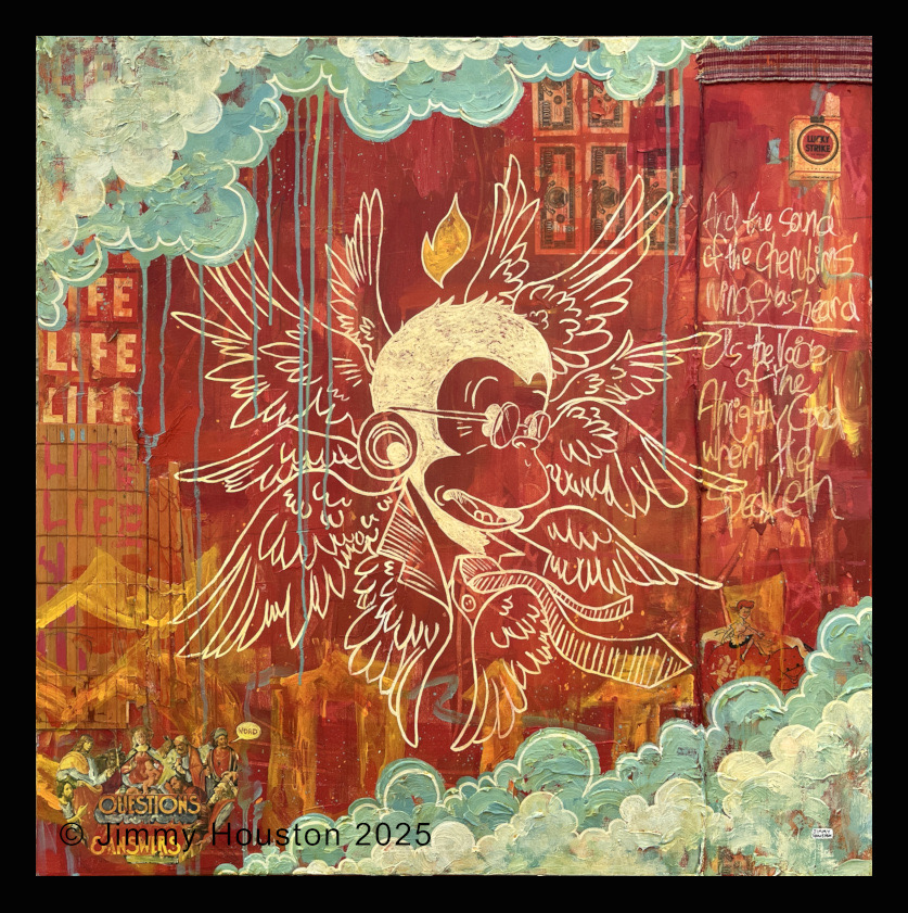 I draw inspiration from old cartoons, comics, and vintage ads, blending nostalgia with today’s cultural and spiritual questions. My paintings often ask more than they answer, using humor and color to cut through the gloom of our times.